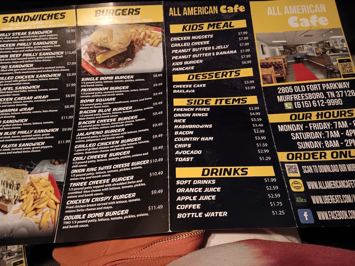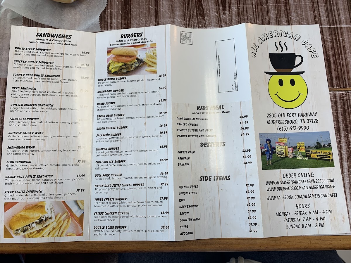 Welcome to All American Cafe, your go-to spot in Murfreesboro, TN for a diverse and hearty menu. Start your day right with their delicious breakfast plates, featuring customer favorites like the towering Fat Omelet or the flavor-packed 3Meat Omelet. Each dish is made fresh, showcasing the cafe's commitment to quality.
